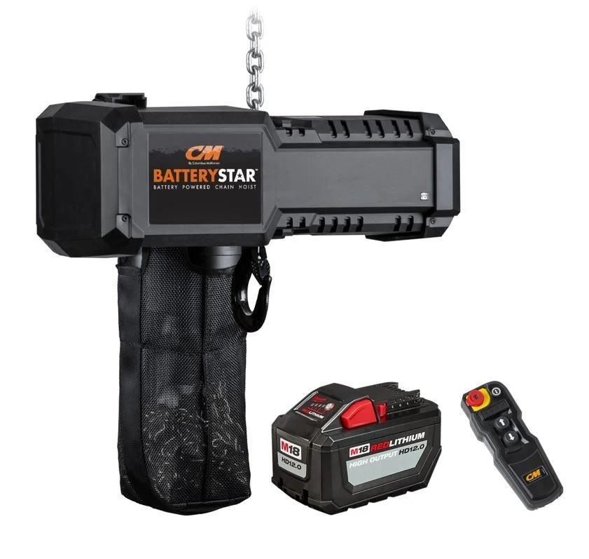 El nuevo polipasto portátil CM Batterystar, energizado a través de batería, puede levantar objetos en minutos. Alimentado por una batería M18 de Milwaukee Tool, esta diseñado para levantar cargas pesadas. Controlado de manera inalámbrica para mantener al operador alejado del área de carga. El control remoto también incluye inteligencia incorporada, que alerta de sobrecargas o notifica de una inspección de mantenimiento. El Baterrystar funciona ya sea para elevar material en sitios de construcción o moviendo equipos para conciertos. Ofrece potencia y velocidad para cualquier aplicación, especialmente cuando no hay energía externa disponible.